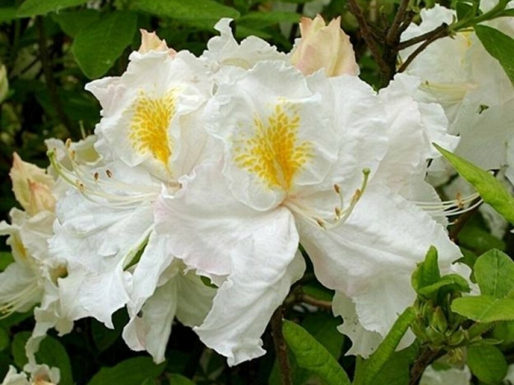 Азалия белая "Оксидол" (Oxydol) - это декоративный листопадный кустарник высотой до 1,2 м и шириной 1,4 м (в возрасте 10 лет). Цветет обильно во второй - третьей декаде мая. Цветение начинается одновременно с развертыванием листьев. Цветки крупные (до 8 см), чисто белого цвета с небольшим желтым пятнышком на одном из лепестков, цветки собраны в соцветия по 6 - 10 шт. Цветущий кустарник выглядит очень нарядно! Высаживать азалию рекомендуется на кислых, плодородных, хорошо дренированных почвах. Для посадки следует выбрать места, защищенные от ветра. Предпочитает легкую полутень. Кустарник очень влаголюбив, поэтому при выращивании необходим регулярный полив. Растения хорошо себя чувствуют при посадке вблизи хвойных растений, а также водоемов. Морозоустойчивый сорт, но на случай суровой и малоснежной зимы рекомендуется воздушно-сухое укрытие. Широко используется в дизайне, хорошо смотрится как в одиночных, так и в групповых посадках.
