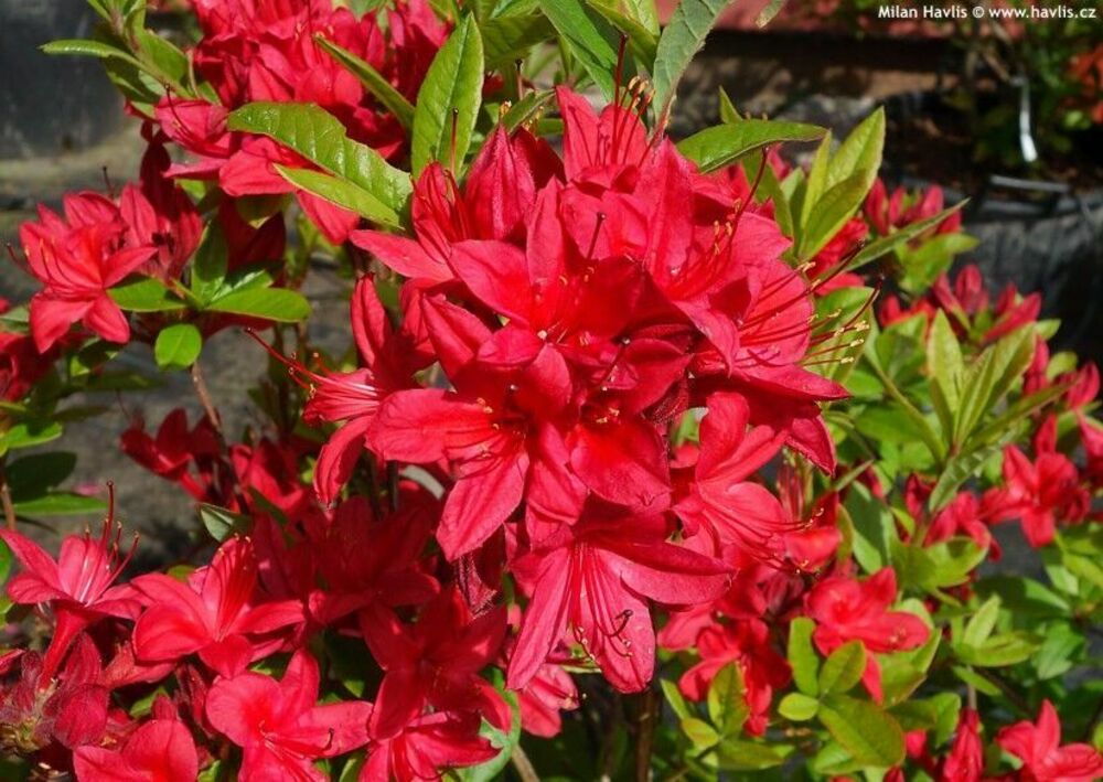 Азалия листопадная Karminduft – лучший выбор среди поздно цветущих азалий. Цветки карминово-красные, с вишневым оттенком, очень душистые. Цветение обильное и нарядное, цветет долго. Развивает густую крону, куст рослый, крепкий, с сильными побегами. растет с умеренной скоростью, зимует стабильно. Осенняя окраска листьев у азалии Карминдуфт в винно-пурпурных тонах.
