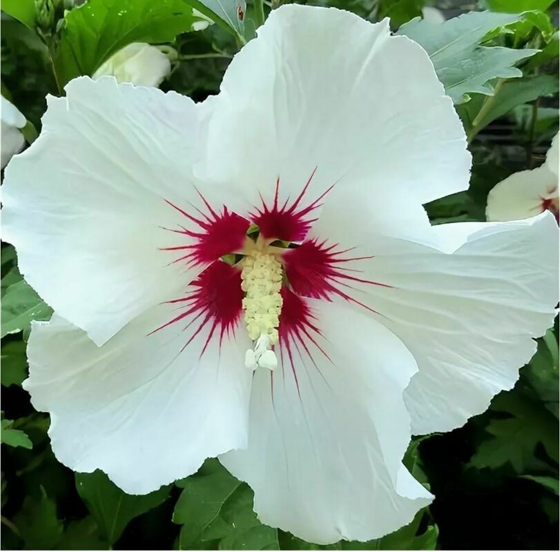 Листья имеют яйцевидную форму и крупные размеры - от 5 до 10 см. Они зеленого цвета. Цветки крупные, размером около 13 см, белоснежные, в центре находится карминовое пятно. Цветы простые.