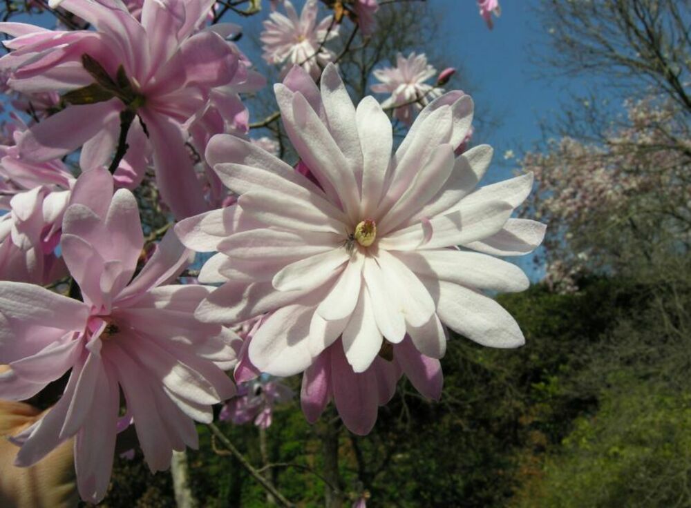 Магнолия звездчатая "Розеа" - медленнорастущий кустарник, до 3м высотой. Самая маленькая и изящная из всех декоративных магнолий, имеющая овальную регулярную крону. Образует густой ветвистый, пышный куст. Прирастает около 15 см в год. Цветочные бутоны розового цвета. Цветочные почки розовые, цветки звёздчатые, снаружи слегка розоватые, со временем почти белые, с узкими, растопыренными чашелистиками до 15 см в диаметре, с многочисленными, лентообразными, вытянутыми, бледно-розовыми лепестками, направленными во все стороны звездчато, слегка душистые. Цветет обильно иногда даже в марте, но обычно в апреле, задолго до появления листьев. Листья узкие, обратнояйцевидные или широколанцетные длинной 4-14 см, с верхней стороны тёмно-зелёные, снизу более светлые. Предпочитает свежие, влажные, плодородные, гумусные и рыхлые садовые почвы с кислой реакцией, хорошо растёт также и на умеренно сухих почвах с щелочной реакцией, если корни замульчированы органическими материалами.Хорошо переносит морозы, однако весенние заморозки могут повредить цветки. Зона морозостойкости 6 (до -23°С).
