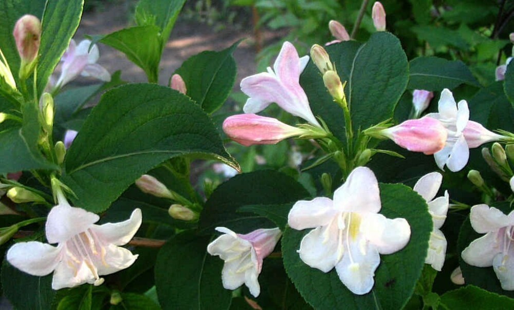 Вейгела цветущая «Альба» (Weigela florida ‘Alba’) — высота куста 3 м, диаметр кроны около 3,5 м. Цветки белые, розовеющие при отцветании. Листья с белыми крапинками.